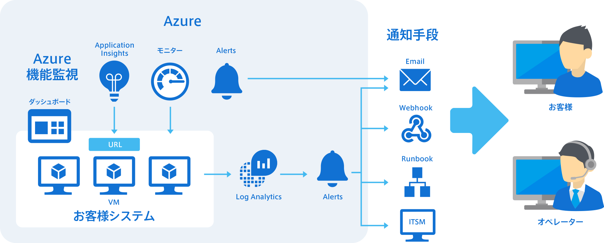 Azure基盤の正常性 | ー | SMS メール通知 Webhook Runbook ITSM |