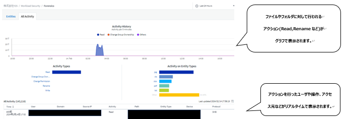 管理ポータル画面では、ファイルに対するアクセスユーザ、操作(Read/Writeなど)、アクセス元IPアドレス、アクセス日時などがリアルタイムで表示されます(実際の画面は