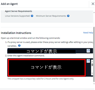 インストール用のコマンドをコピーして、エージェントサーバ上で実行します。