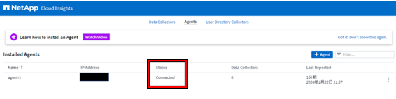 エージェントが登録されました。[Status]が[Connected]になっていることを確認します。