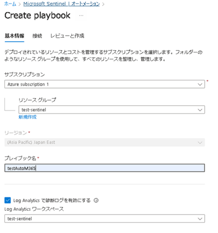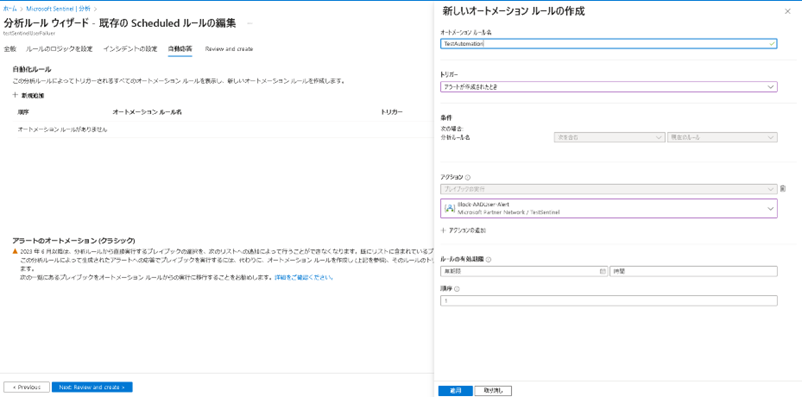 分析ルールに続いて、先ほど作成したプレイブックを自動化ルールで紐づけていきます。