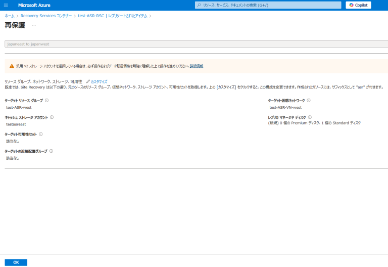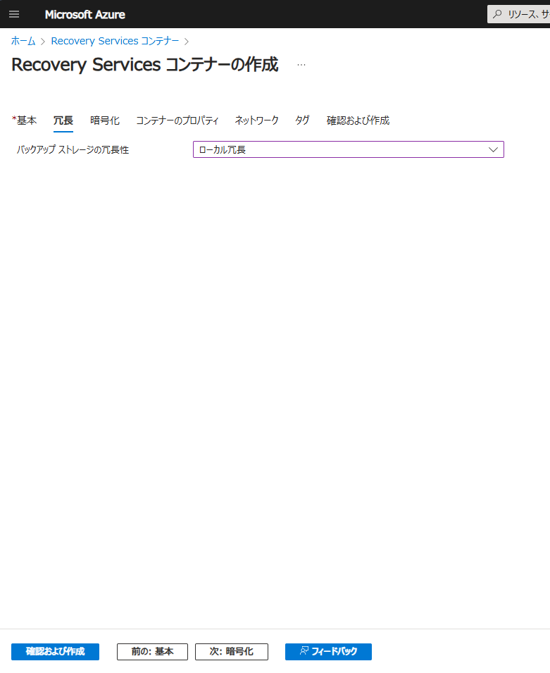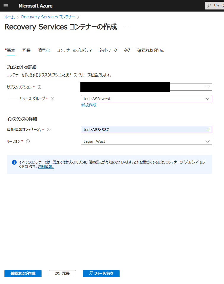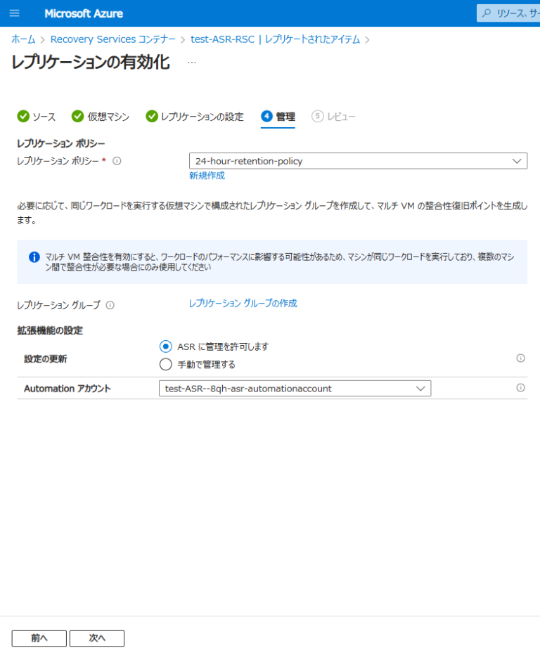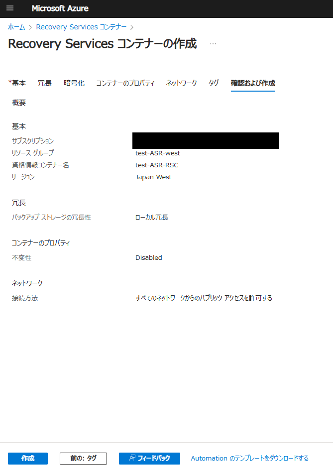 上記で「①Recovery Serviceコンテナーの作成」が完了したため、