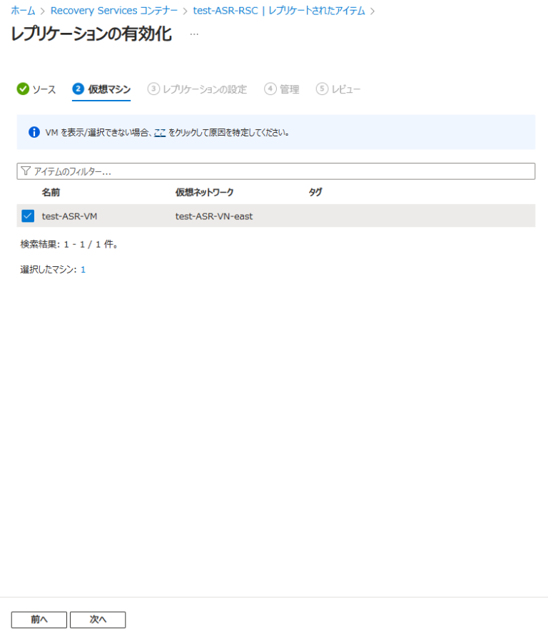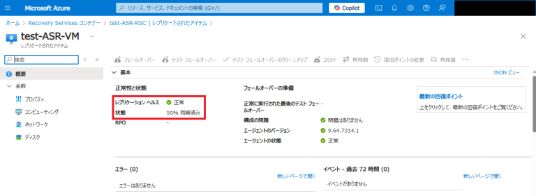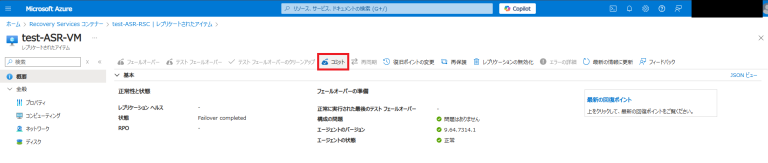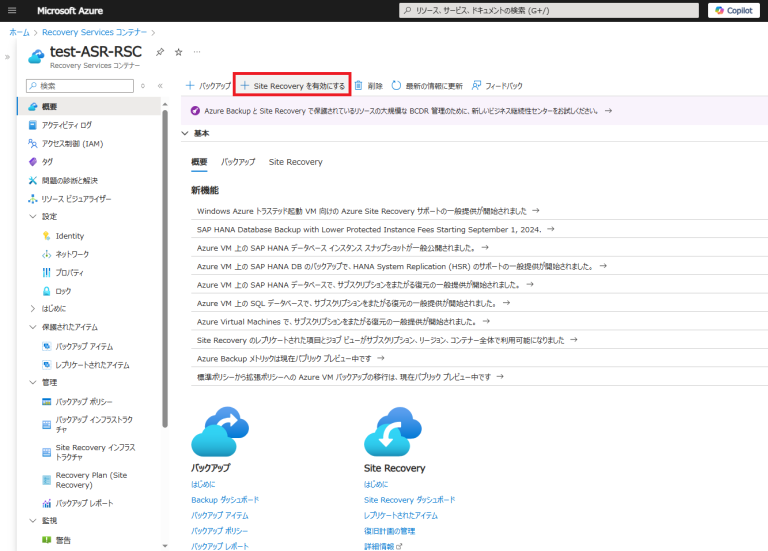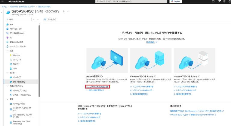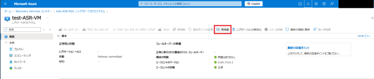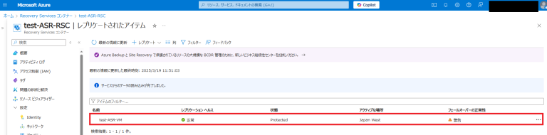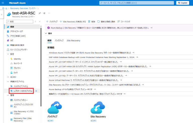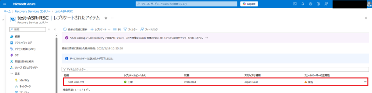 ASRを設定したRecovery Services コンテナーの左メニューから、