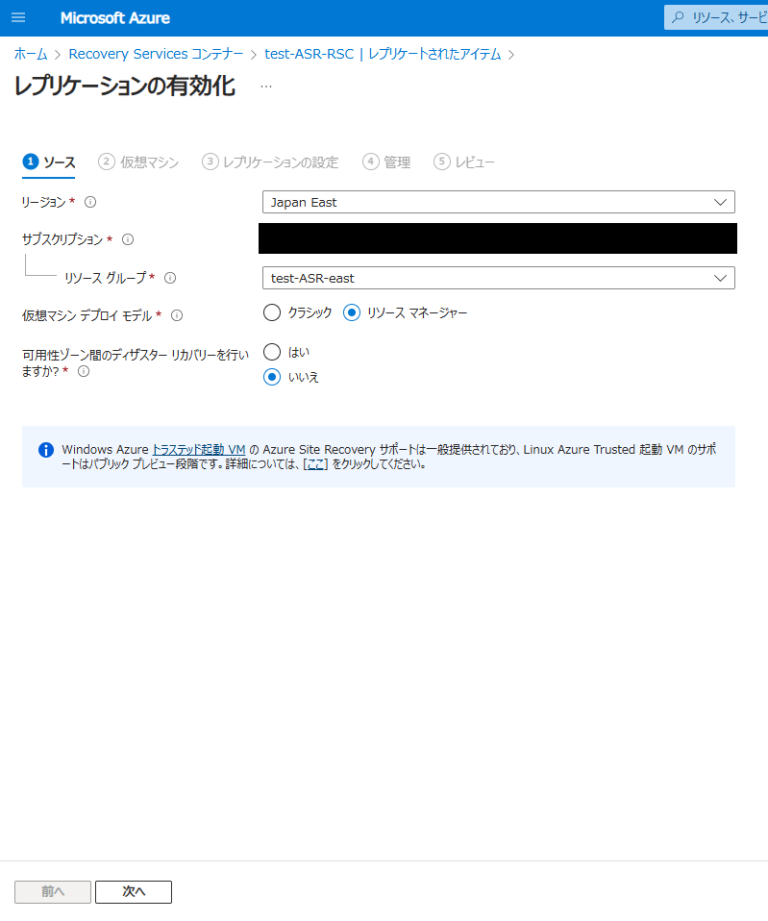 移行先のVMを配置するリージョン、サブスクリプション、リソースグループ、