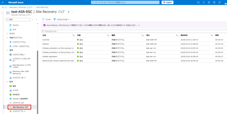「監視」>「Site Recovery ジョブ」を選択すると確認可能です。