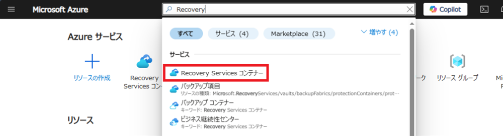まずは検索欄で「Recovery Serviceコンテナー」を検索します。