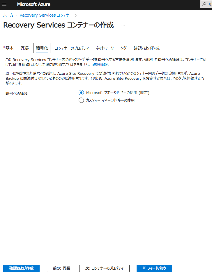 今回は既定の「Microsoft マネージドキーの使用」を選択した状態で次のタブに進みます。