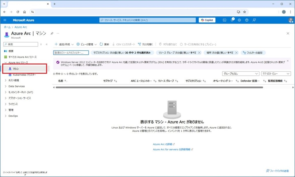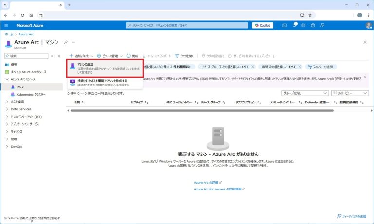 移動し、サイドメニューより『Azure Arc リソース』―『マシン』を開きます。