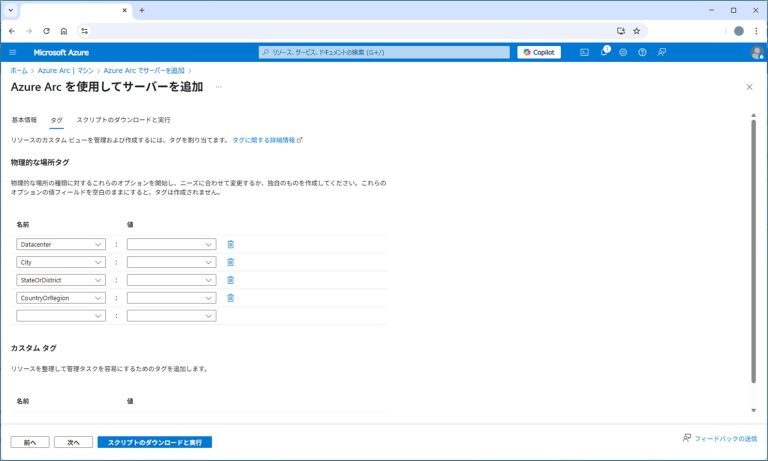 - 『タグ』設定画面にて、Azure Arc登録時に付与されるタグ情報を定義します。必要に応じて