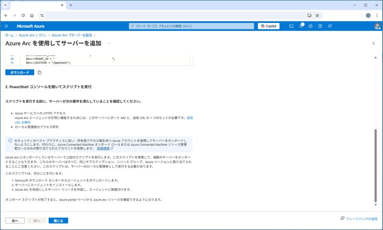 - Azure Connected Machine Agentをインストールするためのスクリプトが生成されたので、『ダウンロード』を押下し、スクリプトを取得します。尚、以下画面はWindows用の
