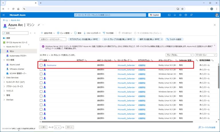 ログイン後、最後のインストール処理が完了すると、Azure Arcの登録が完了し、Azureポータル側のAzure Arcセクションにて接続状況を確認する事ができます。