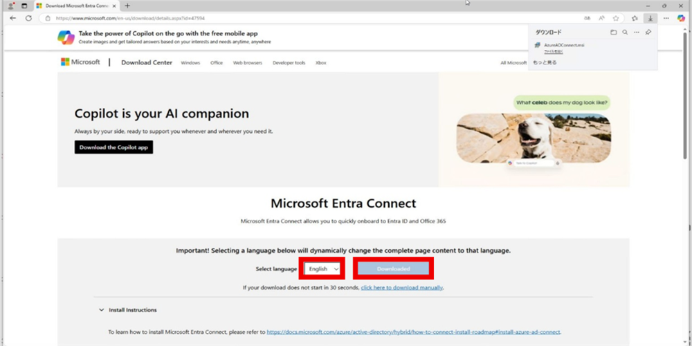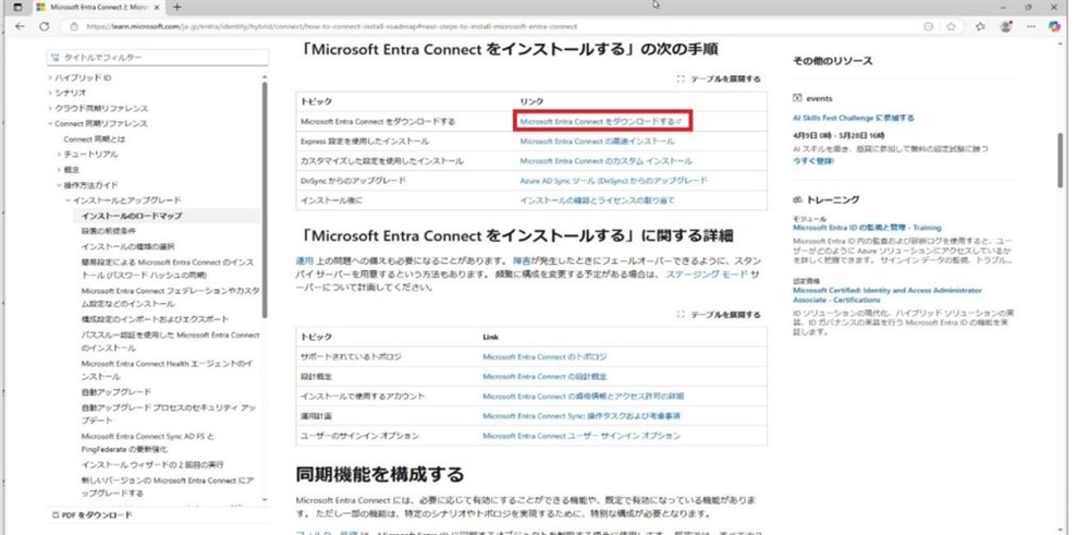 Entra Connect用サーバで下記URLにアクセスし、「Microsoft Entra Connectをダウンロードする」を押下する。
