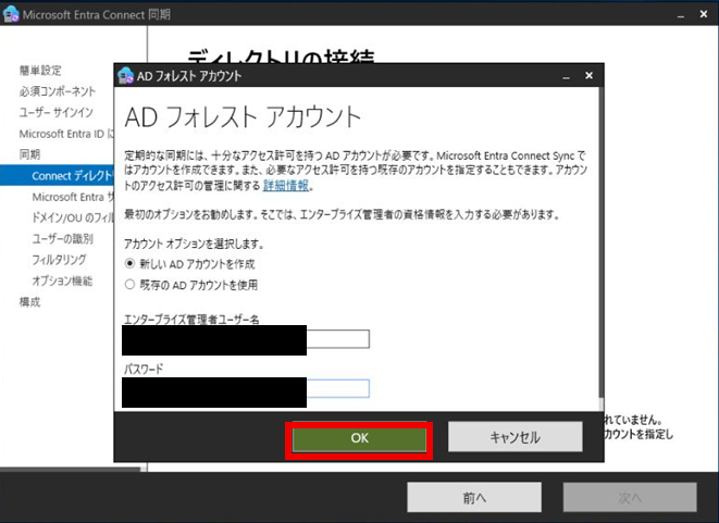 「新しいADアカウントを作成」を選択し、作成したエンタープライズ管理者のユーザ名とパスワードを入力して「OK」を押下する。
