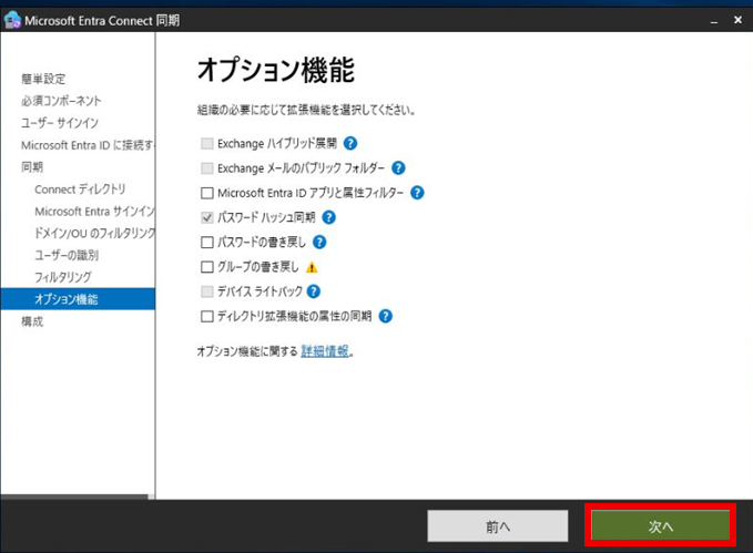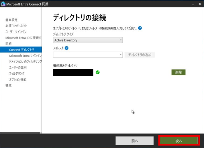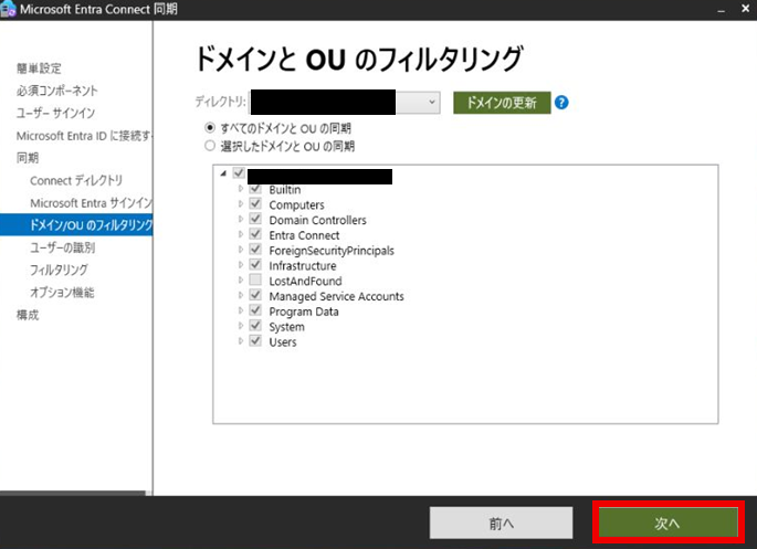 「ドメインとOUのフィルタリング」で同期したいOUにチェックを入れ、「次へ」を押下する。