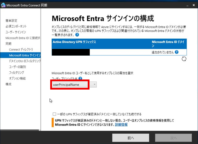 「ユーザープリンシパル名」で、Entra IDユーザ名として使用する任意のオンプレミス属性を選択する。