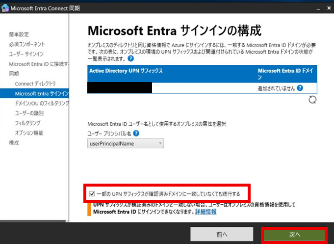 「一部のUPNサフィックスが確認済みドメインに一致していなくても続行する」にチェックを入れ、「次へ」を押下する。