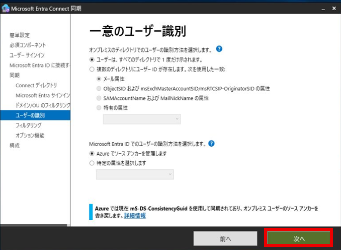 「一意のユーザの識別」で「次へ」を押下する。