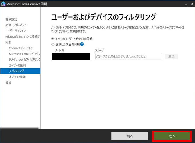 「ユーザおよびデバイスのフィルタリング」で「次へ」を押下する。