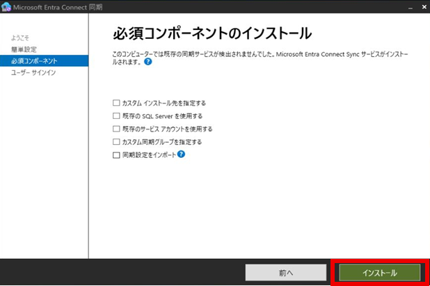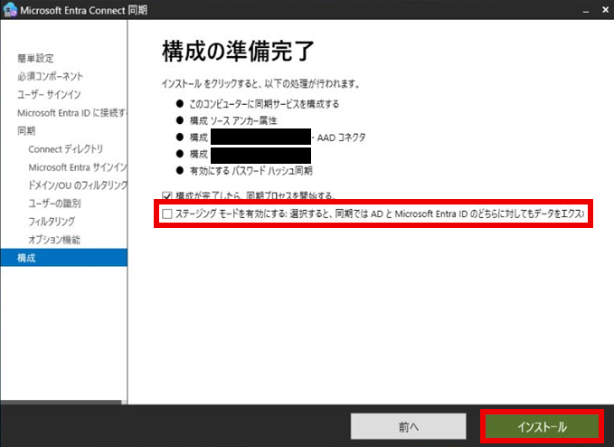 「構成の準備完了」で「構成が完了したら、同期プロセスを開始する」と「ステージングモードを有効にする」にチェックを入れ、「インストール」を押下する。