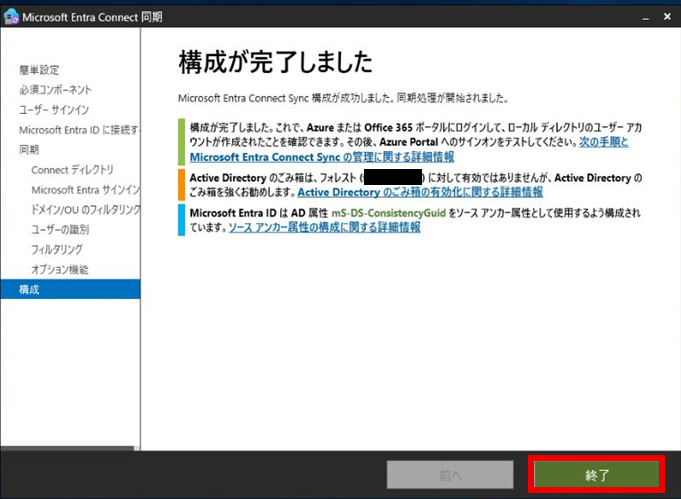 Entra Connectの構成が完了し、同期が開始される。