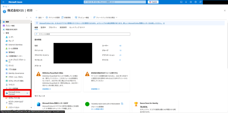 左メニューの「管理」から「Microsoft Entra Connect」を選択する。