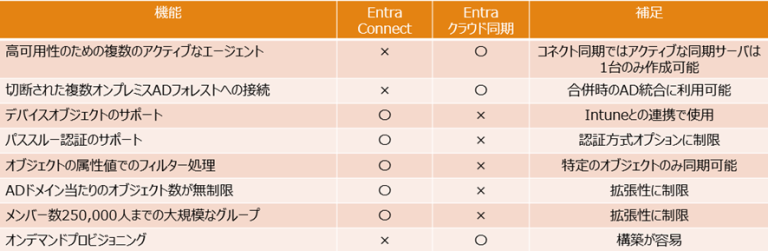 Entra ConnectとEntra クラウド同期の違いについて、簡単な表にまとめてみました。悩んだ際の参考になれば幸いです。