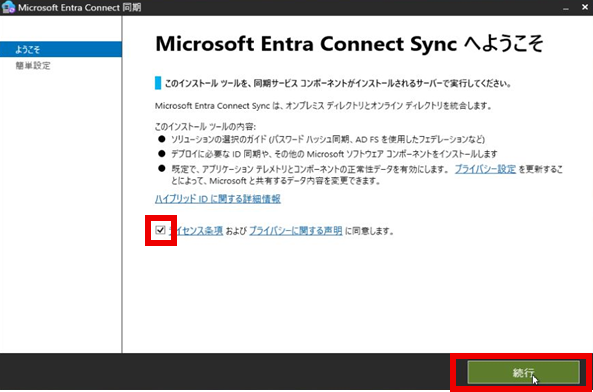 インストーラーを開き、「ようこそ」の画面で「ライセンス条項及びプライバシーに関する声明に同意します」にチェックを入れて「続行」を押下する。