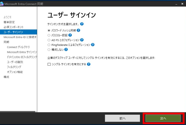「ユーザーサインイン」でサインオン方式を選択し、「次へ」を押下する。