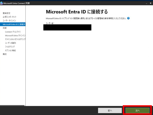 Entra IDのグローバル管理者権限を持つアカウントを入力し、「次へ」を押下する。