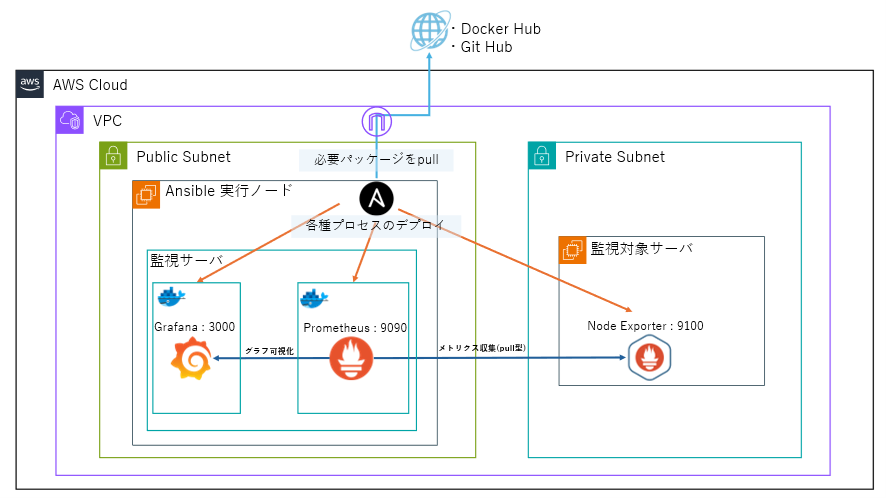 Ansibleをインストールし、Playbookを実行するサーバ。今回はここにPrometheus/Grafanaも同居させ、監視サーバの役割も兼任します。