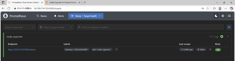 ブラウザで http://<監視元サーバのIP>:9090/targets にアクセスします。Endpointに10.0.2.55:9100が表示され、Stateが UPとなっています。