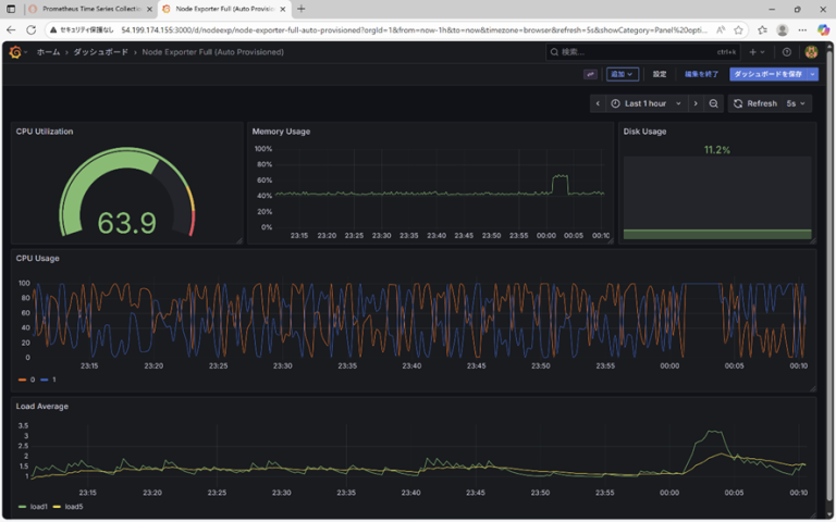 ブラウザで http://<監視対象サーバのIP>:3000 にアクセスし、自動作成されたダッシュボードを確認します。 CPU使用率、メモリ、ディスク容量などのグラフが描画されていることが確認できました。