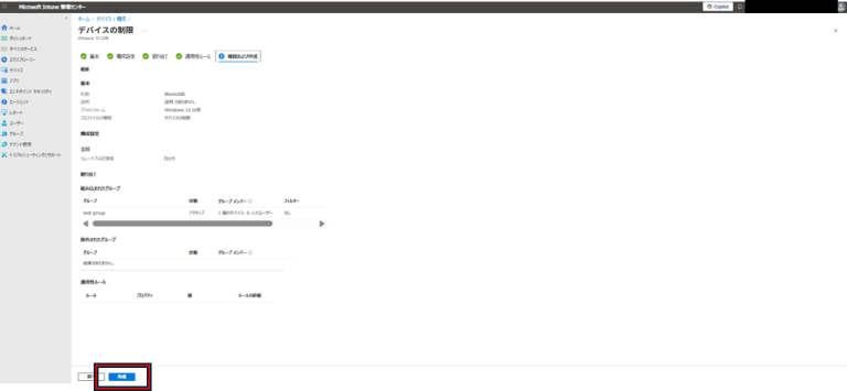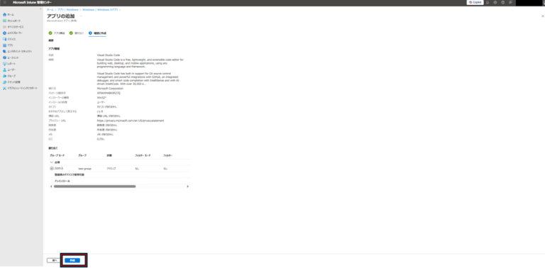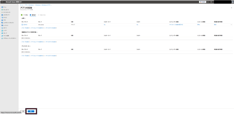 (7)[グループの追加]から、配布対象のデバイスが所属するグループを追加し、[次へ]をクリックします。