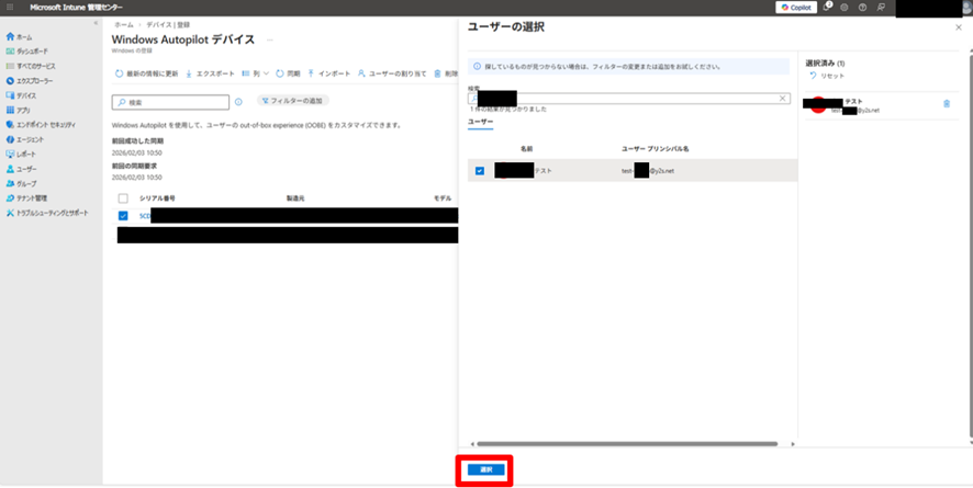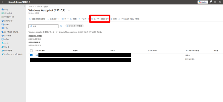 「Windows Autopilot」画面から今回追加した対象デバイスを選択し、「ユーザーの割り当て」をクリックします。