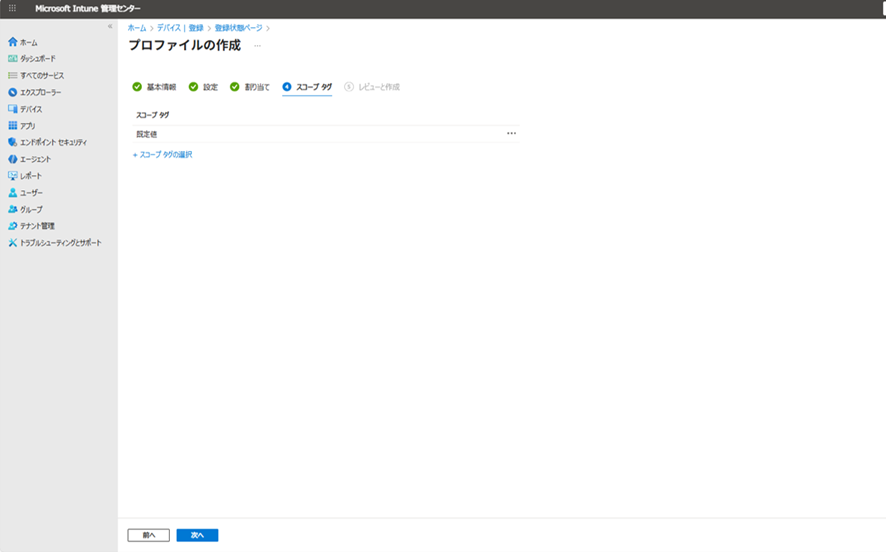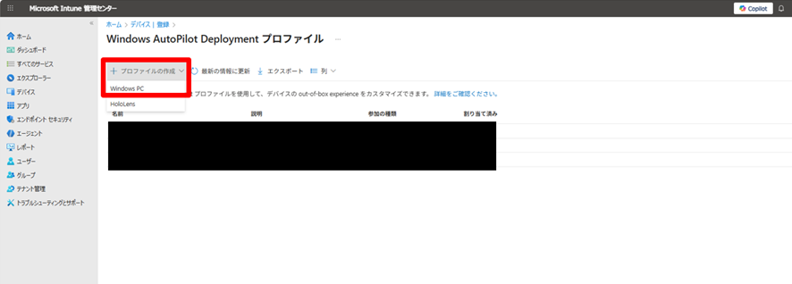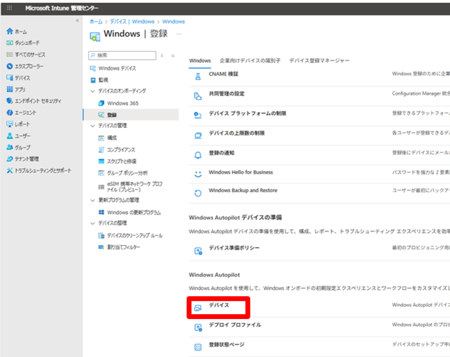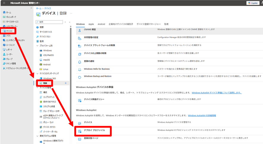 Intune管理センターから「デバイス」>「登録」>「Windows」>「デプロイプロファイル」を