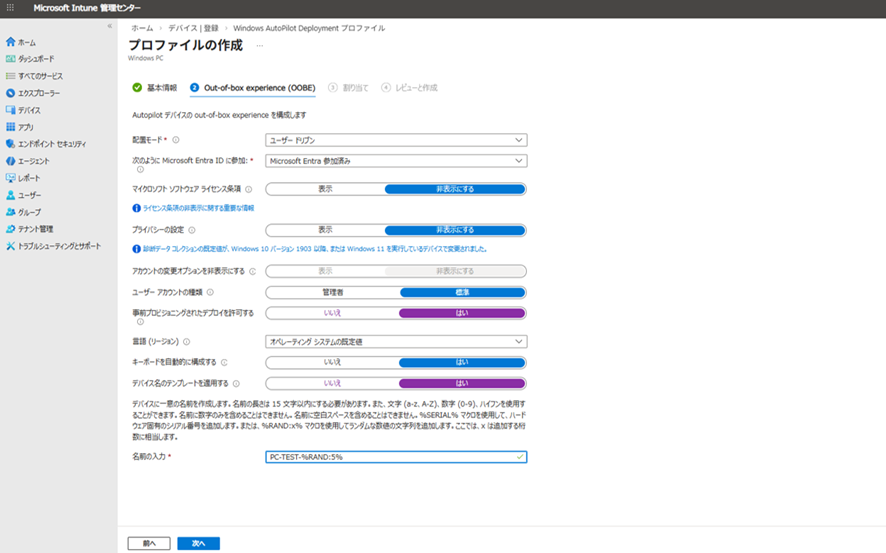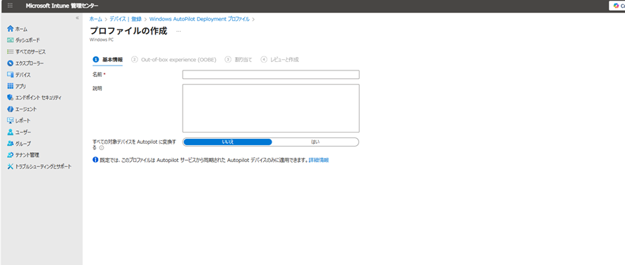 「基本タブ」で「名前」は任意、「すべての対象デバイスをAutopilotに変換する」は「いいえ」を選択して「次へ」をクリックします。