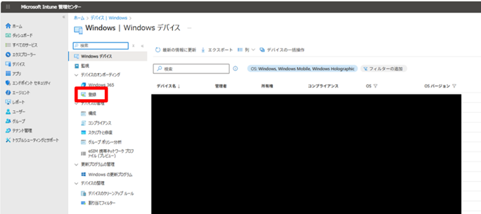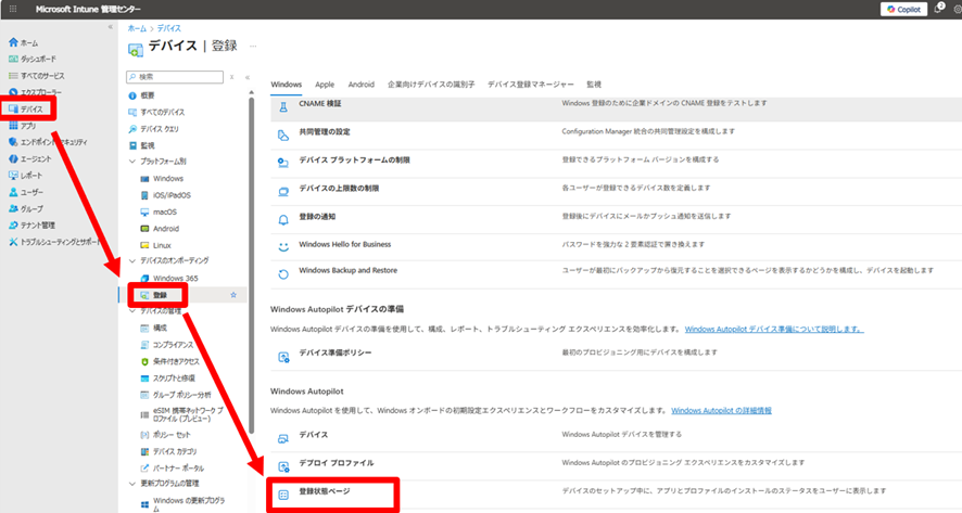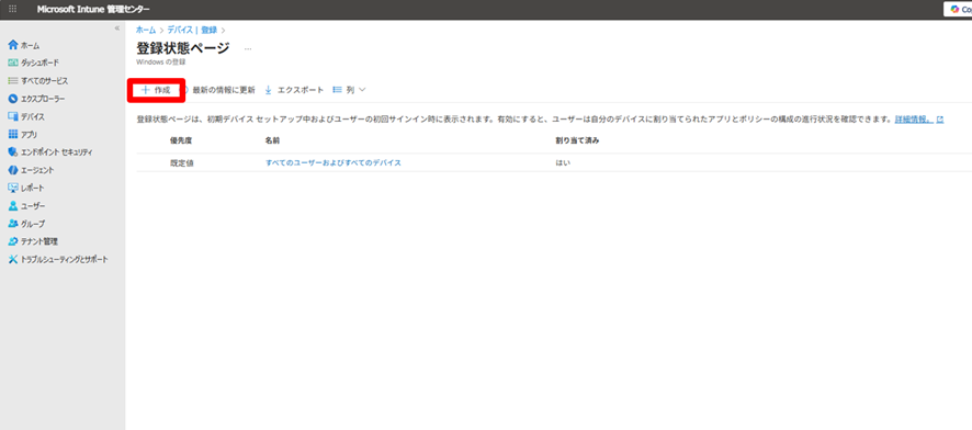 Intune管理センターから「デバイス」>「登録」>「Windows」>「登録状態ページ」を