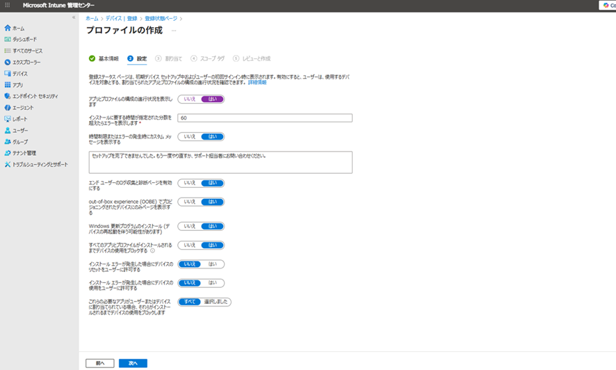 「基本情報」では任意の名前を設定し、「設定」ではアプリとプロファイルの構成の進行状況を表示するように以下のように設定します。