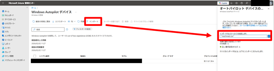 「Windows Autopilot デバイス」画面が表示されるため、「インポート」をクリックし、登録したい端末のHWID(CSV形式)をインポートします。