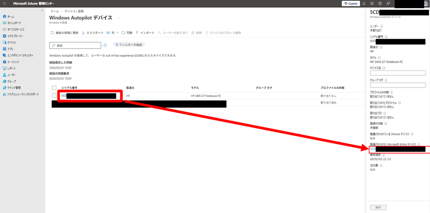 「Windows Autopilot」画面から今回追加した対象デバイスを選択し、「関連付けられた Microsoft Entra デバイス」をクリックします。