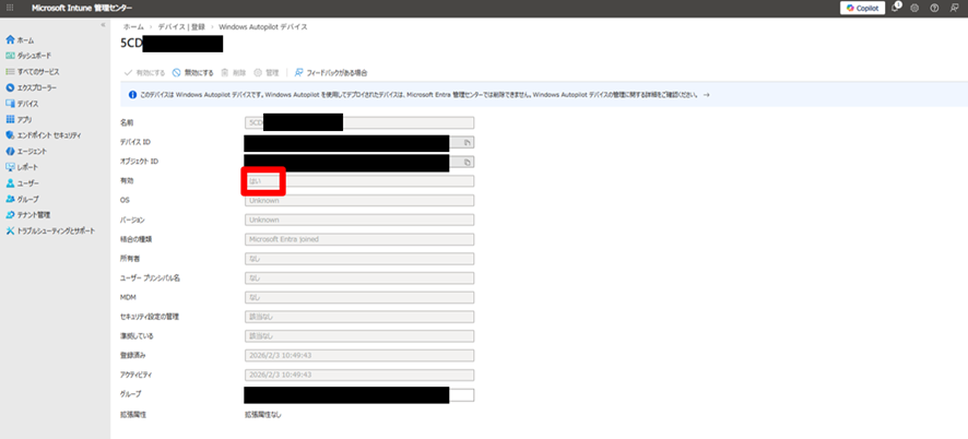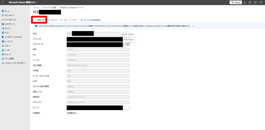 Autopilotデバイス登録後にEntraデバイスが自動作成されるため、デバイスの有効化をします。
